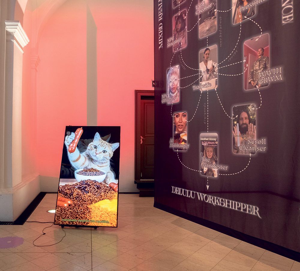 Die Begriffe Work und Worship (übersetzt: Arbeit bzw. Kult und Lobpreisung) verschwimmen hier zu den »Workshippers«, und ihr schreibt weiter: »Ihre Kosmologie digitaler Nutzerarchetypen verbindet Plattformdiagramme mit dem Baum des Lebens«. Sie »definiert das Posten, Scrollen und Monetarisieren als rituelle Gesten algorithmischer Opfergaben neu.«