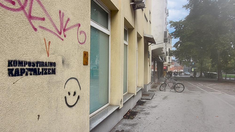 Mit dem zweiten Stadtblick-Bild, dem Stencil »Kompostirajmo Kapitalizem«, das wir im Vorbeigehen erblickt haben, stelle ich fest, dass wir die Szene als vital und kritisch erlebt haben. Somit die eigentliche Frage zur jungen Szene und/oder der Kunst- und Medienkunstszene in Maribor und Slowenien: Wie nimmst du die Szene wahr?